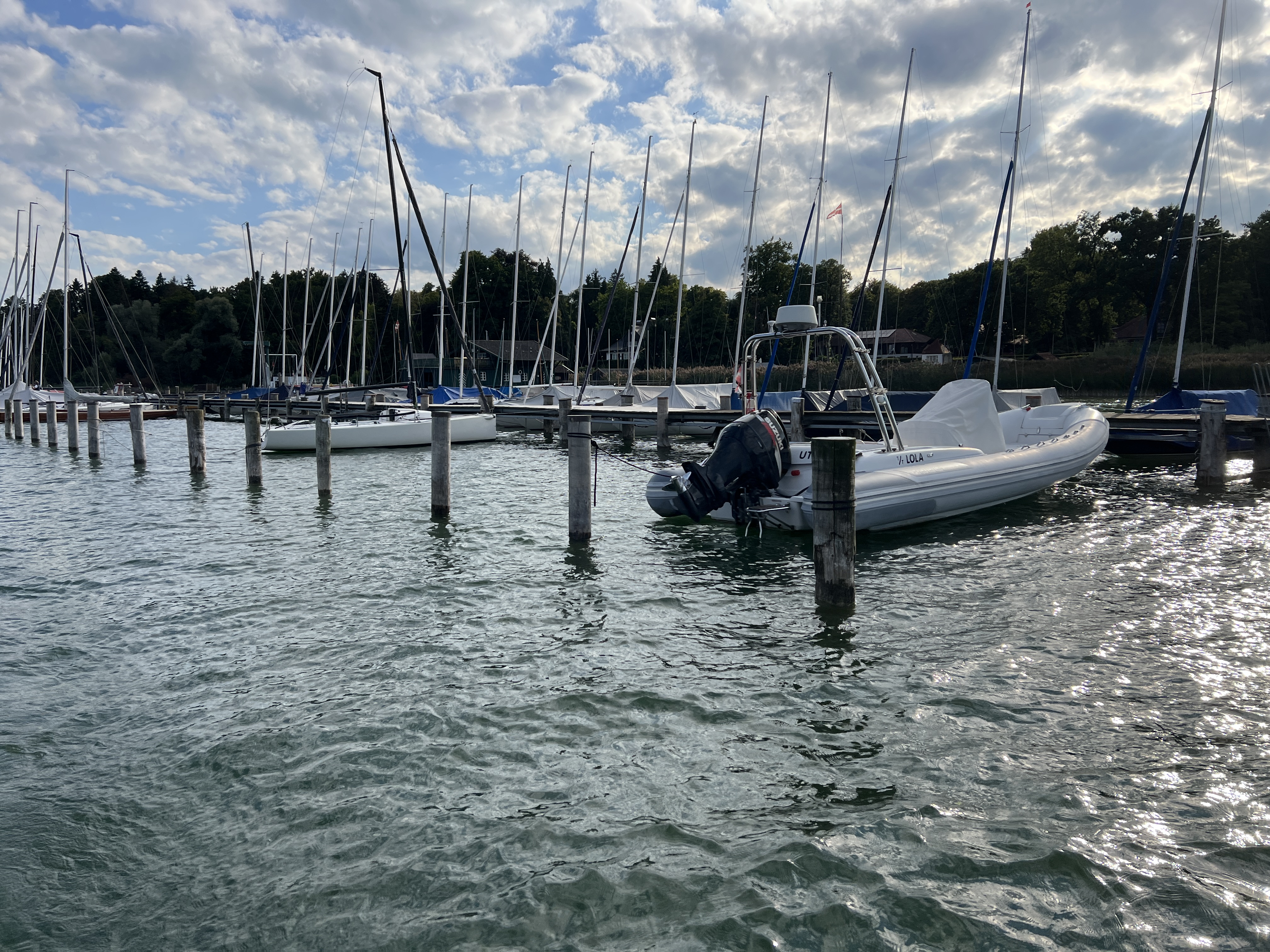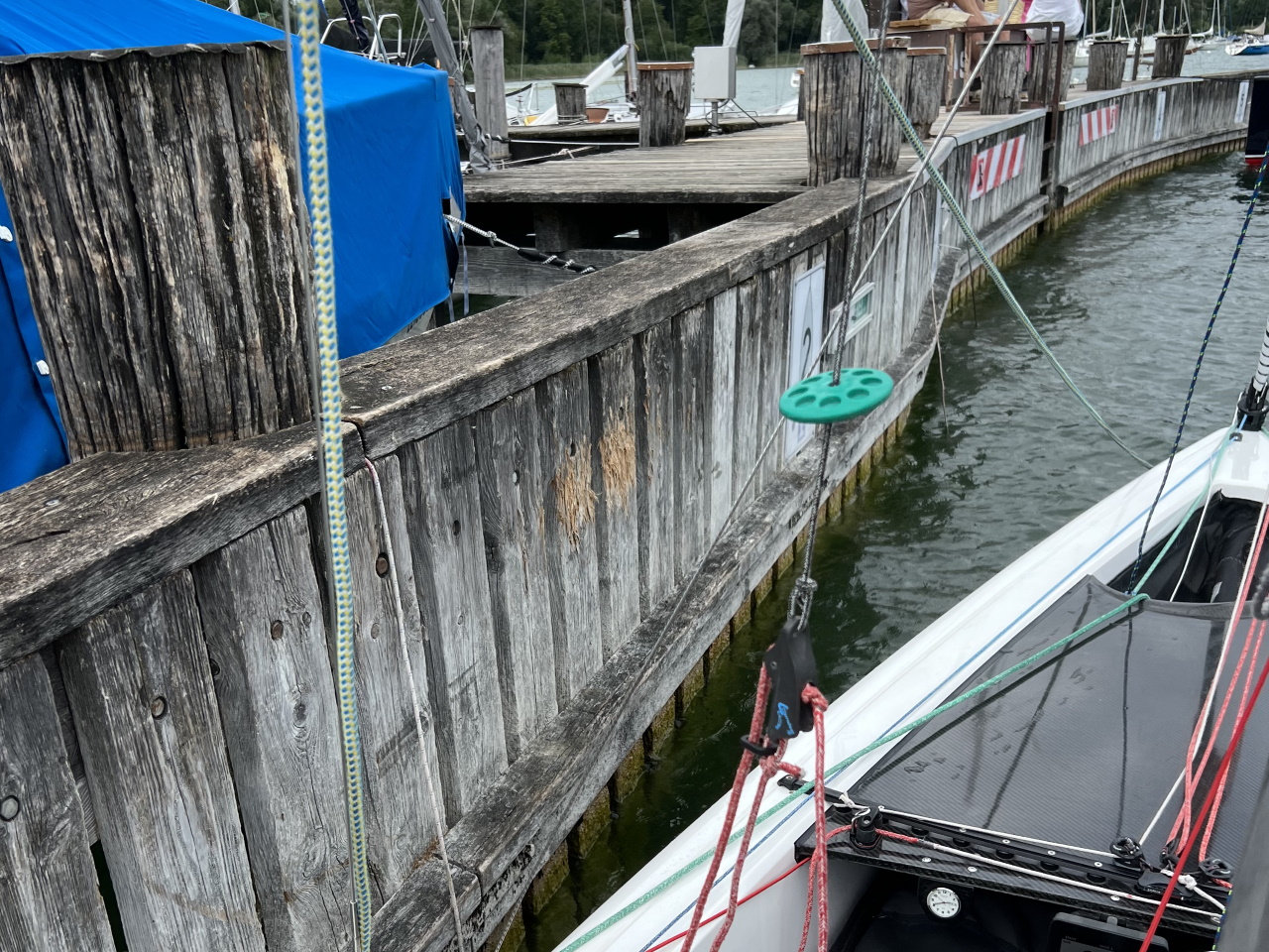Beim ASC kann man gut anlegen. Der Steg hat die Form eines "T"s, an einem Schenkel kann man anlegen. Dachte ich bis jetzt. Aber es geht besser: Am Nordschenkel liegt seeseits am Ende des Stegs ein Motorboot. Neben dem Motorboot sind Anlegeboxen für Gäste (Stand 24.8.25)! Ideal. Beim ASC besteht Hundeverbot (zumindest unbedingt Anleinen!). Die Tiefe am Steg ist mehr als ausreichend.