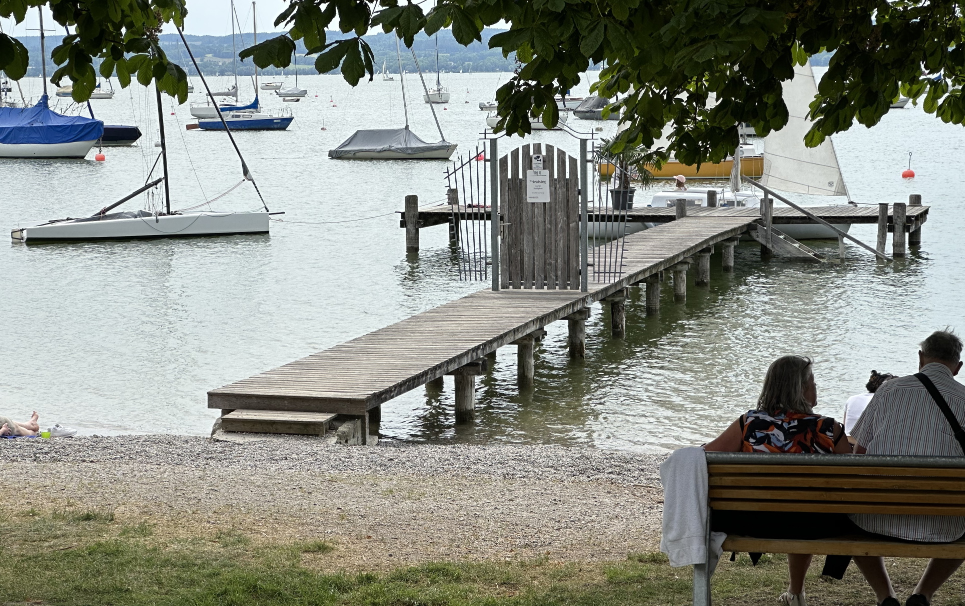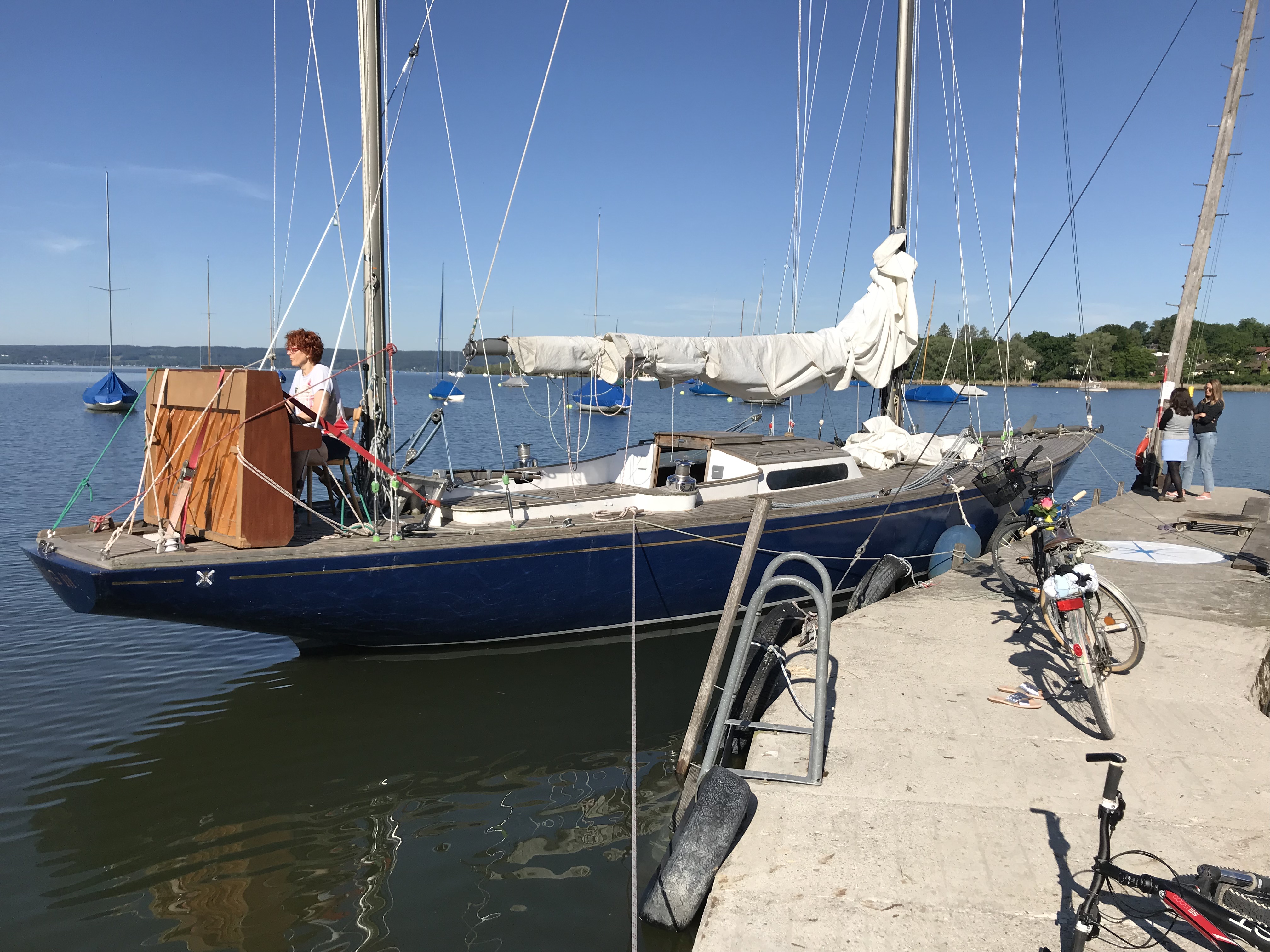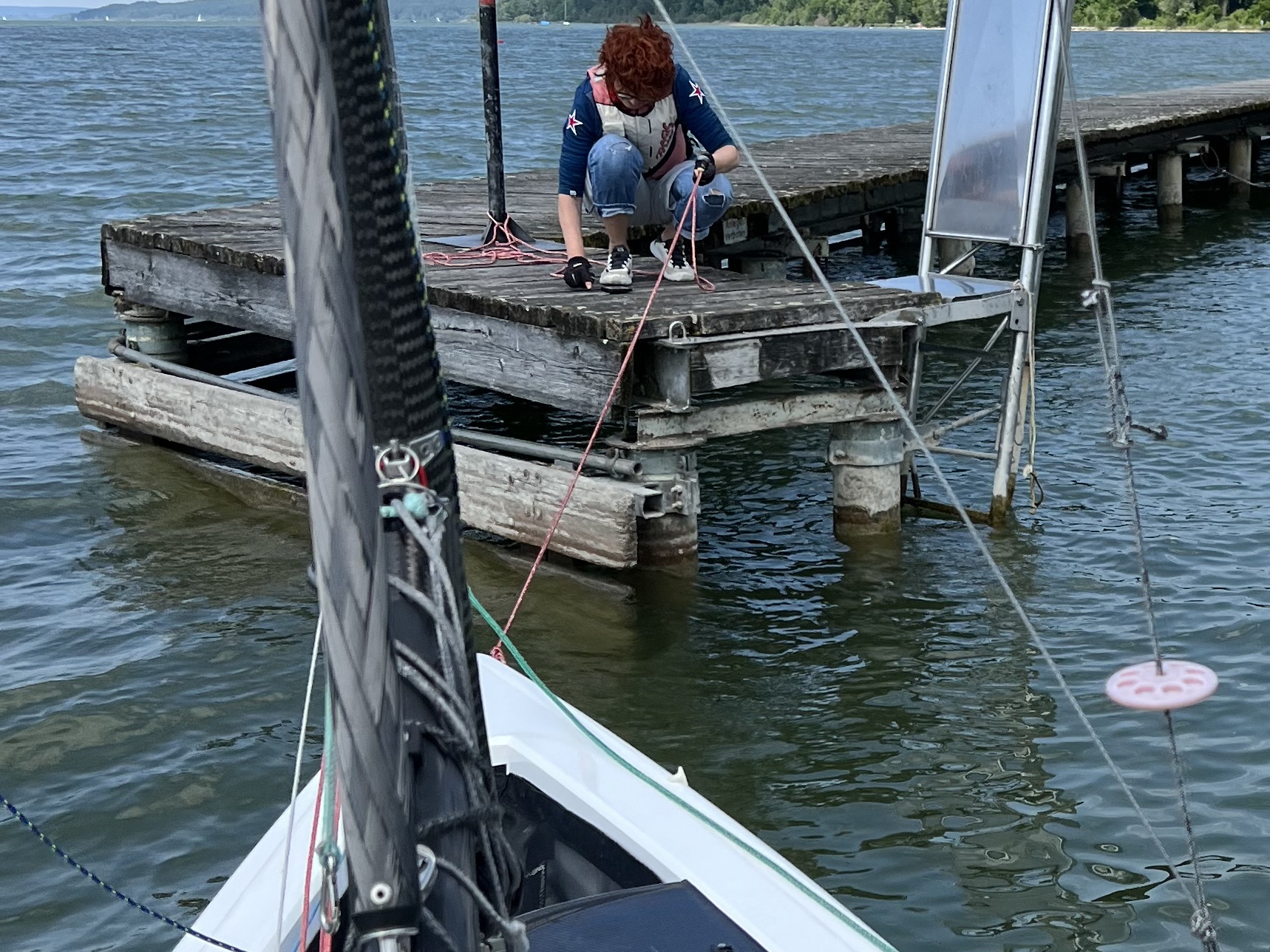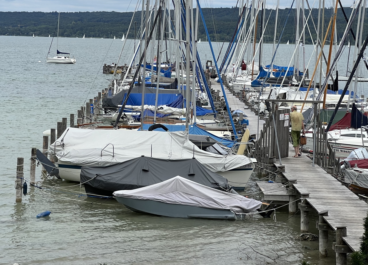 Der Steg hat vorne einen Quersteg, wie bei einem T. An diesem Quersteg darf man anlegen. Die Außenseiten des T's sind etwas wacklig, aber man kann darauf balancieren. Segler sind besonders willkommen: man kann mit Mooring anlegen. Das gibt sonst nicht am Ammersee! Anlegen geht gut, außer bei Ostwind. Die Tiefe am Steg ist kein Problem.