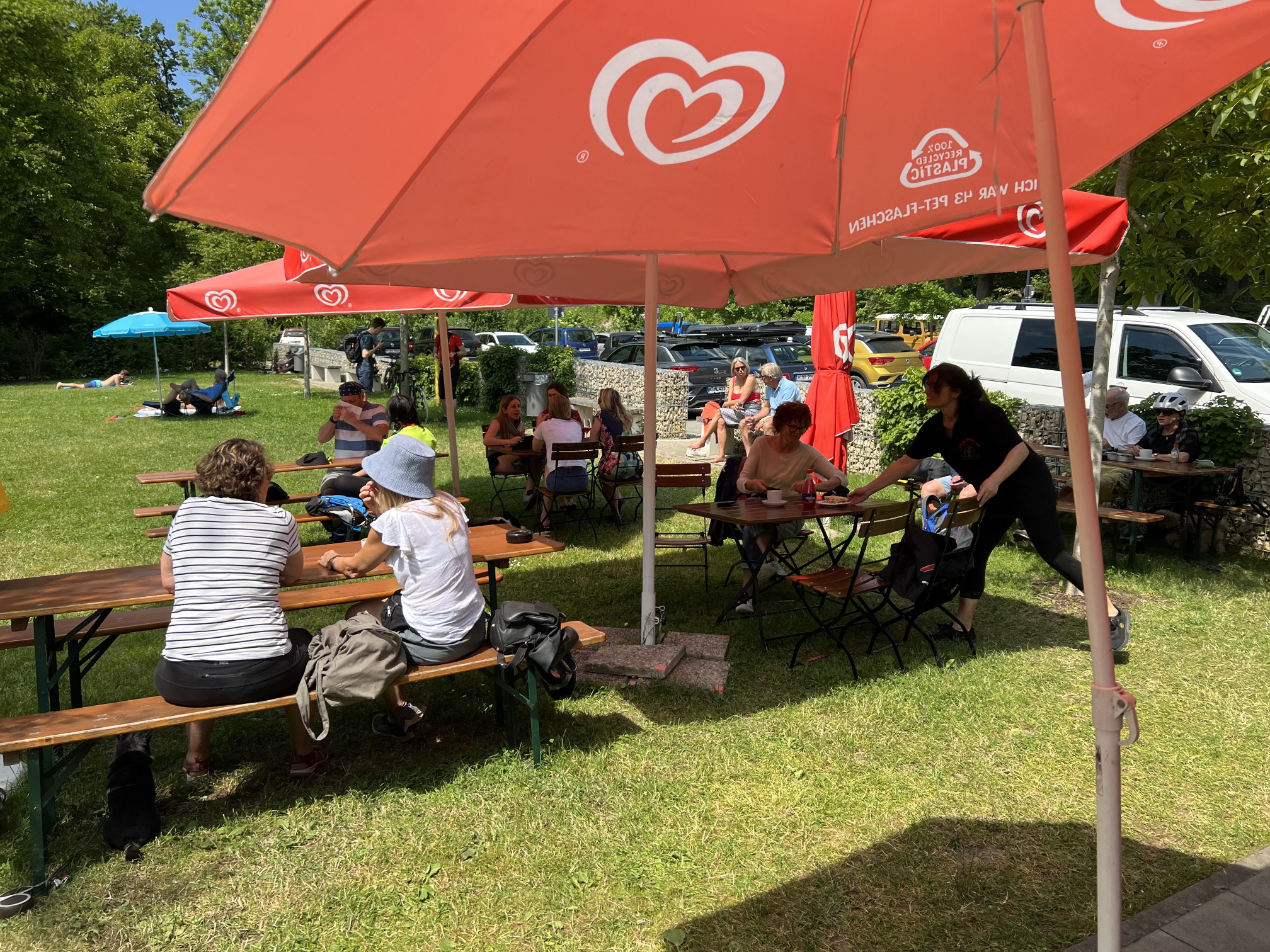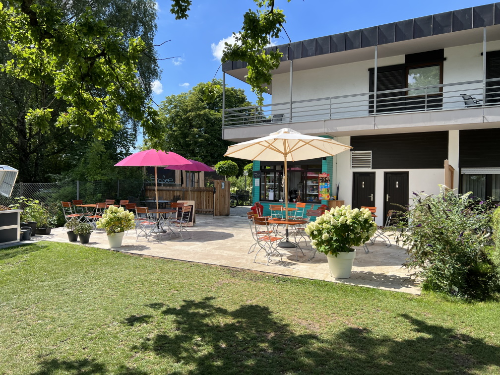 Luciana betreibt den kleinen Kiosk hinter dem Clubhaus. Es gibt kleine Snacks, Kaffee (Siebträgermaschine) und alles mögliche zum Trinken. Man sitzt ganz nett unter Sonnenschirmen und sieht See (und Schiff). Luciana bietet auch Feinkostsachen an.