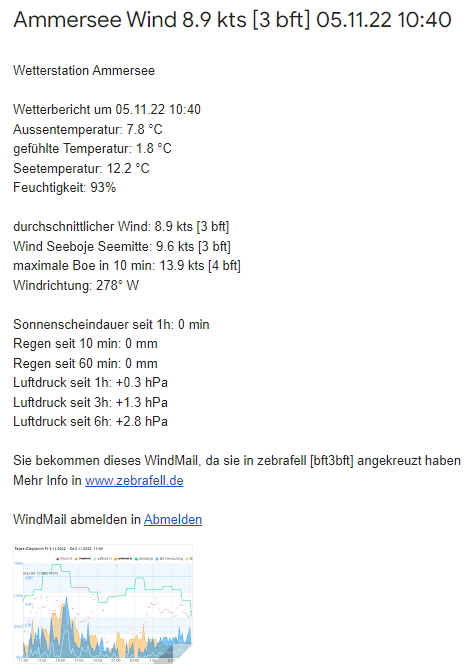 Du kannst kostenlos eine Windmeldung per Email empfangen, wenn die Windstärke eine bestimmte Windstärke erreicht hat und/oder wenn die Sturm- bzw Starkwindwarnung eingeschaltet wurde. Die Sturm- und Starkwindwarnung wird aus den DWD-Unwettermeldungen herausgelesen. Es gibt die Starkwindwarnung (40 Blitze/Min für anhaltenden Wind von 6-7 bft) und die Sturmwarnung (90 Blitze/min für Böen von 8 und mehr bft). Die gemeldete Warnungsart wird in der Betreff-Zeile des Emails durchgegeben.